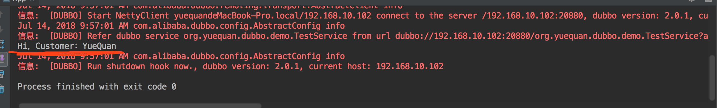 还记得控制台日志输出的地址吗,这里就是了,现在暂时不用注册中心,先来一个最简单的点对点通信,接着我们来写客户端的启动类,通信协议默认是使用的dubbo其默认端口就是 20880