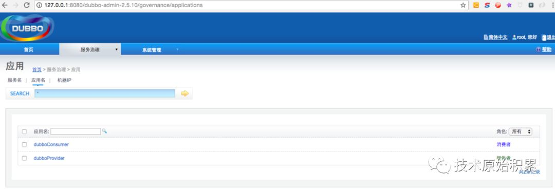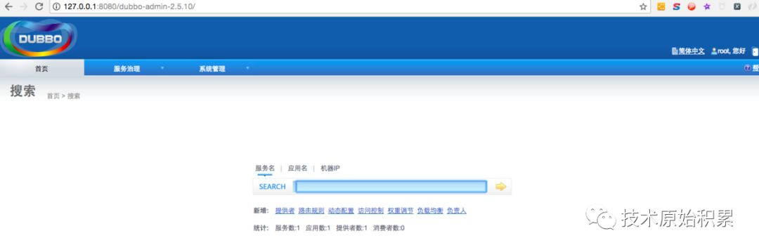 启动后访问 http://127.0.0.1:8080/dubbo-admin-2.5.10/ 会出现下面界面:用户名和密码输入root,进入下面界面: