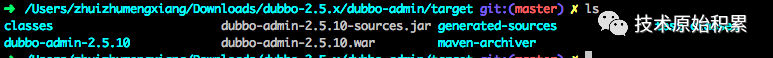 进入/Users/zhuizhumengxiang/Downloads/dubbo-2.5.x/dubbo-admin/target目录,会发现生成了dubbo-admin-2.5.10.war: