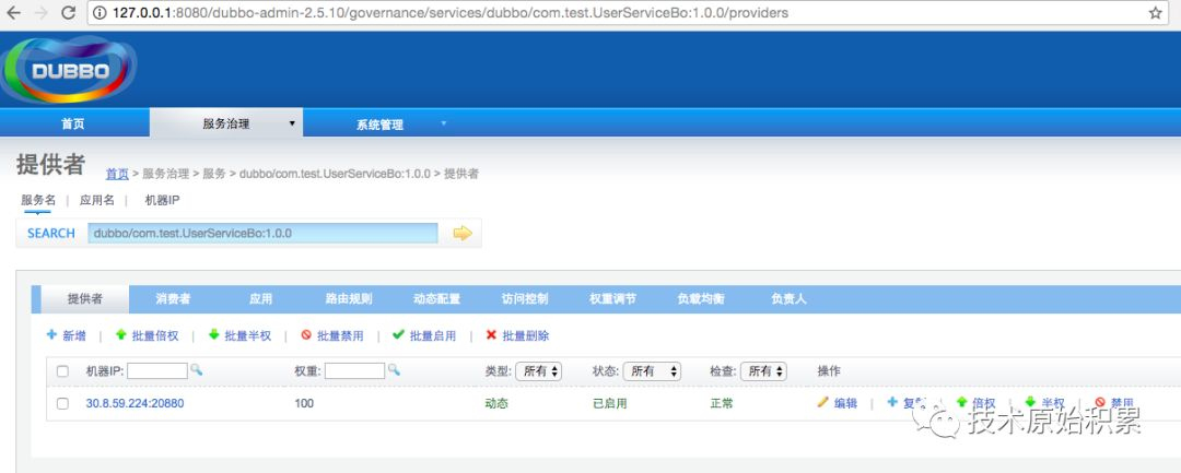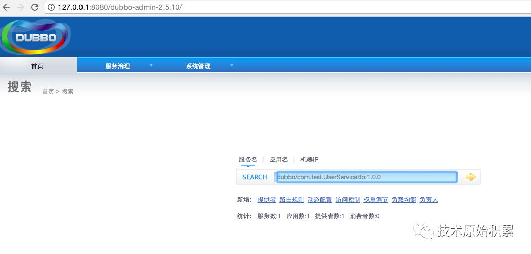 当你需要管理 Dubbo 的服务时,首先要搜索到这个服务,然后打开它的管理页面,比如搜索:dubbo/com.test.UserServiceBo:1.0.0