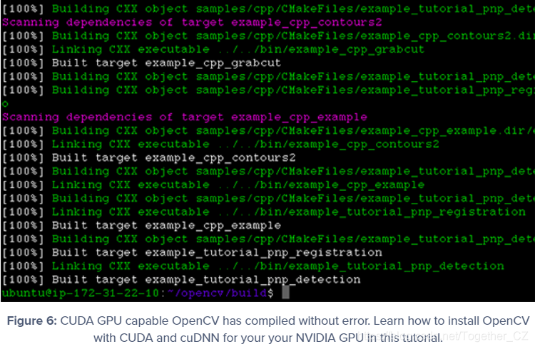 如果 cmake 没有错误退出,您可以使用以下命令编译具有 NVIDIA GPU 支持的 OpenCV: