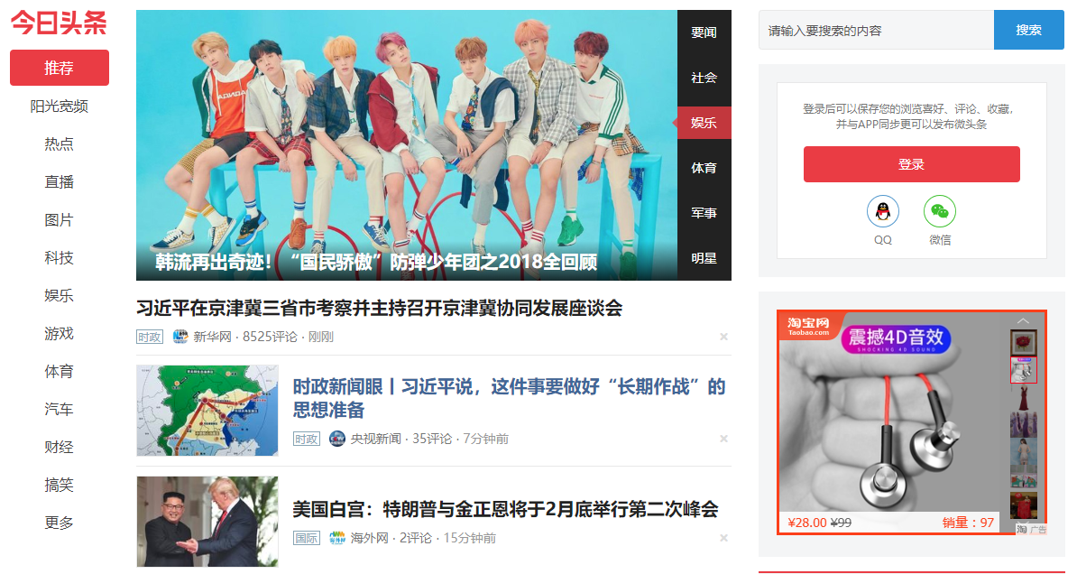 1 在抓取之前,首先要分析抓取的逻辑,打开今日头条的首页http://www.toutiao.com/
