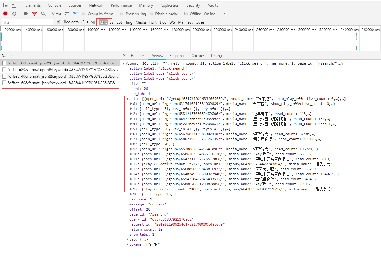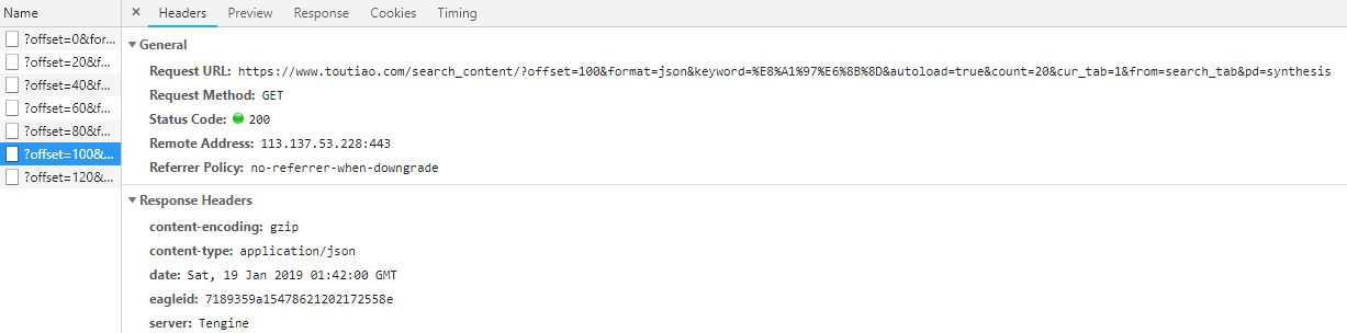 可以看到,这是一个GET请求,请求URL的参数有offset、format、keyword、autoload、count、cur_tab、from和pd。我们需要找出这些参数的规律,因为这样才可以方便地用程序构造出来。