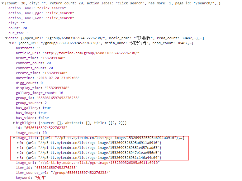 4 我们的目的是要抓取其中的美图,这里一组图就对应前面data字段中的一条数据。每条数据还有一个image_listl字段,它是列表形式,这其中就包含了组图的所有图片列表。