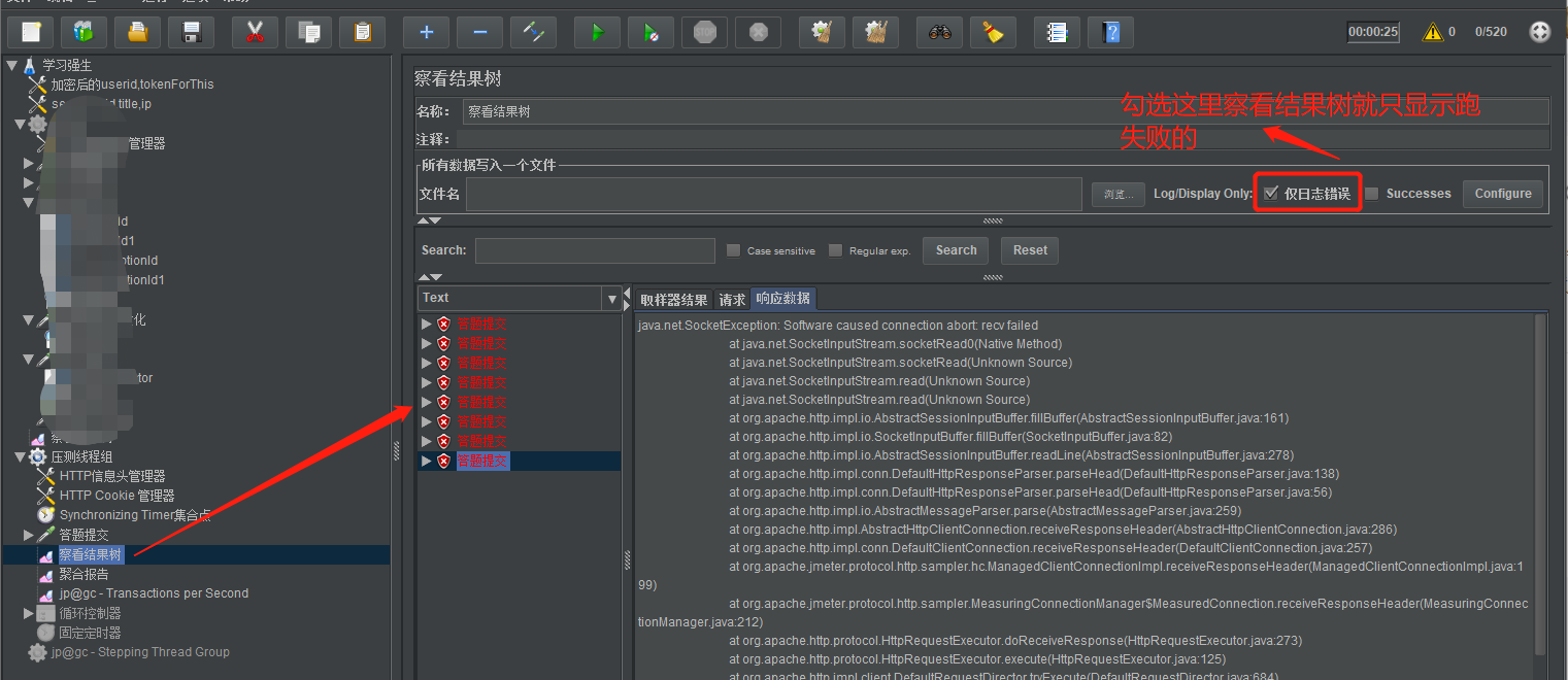 2.在压测并发的过程中,由于跑的请求比较多,这是我们可以把跑成功的请求过滤掉,只显示跑失败的请求。只需要勾选在察看结果树勾选:仅日志错误