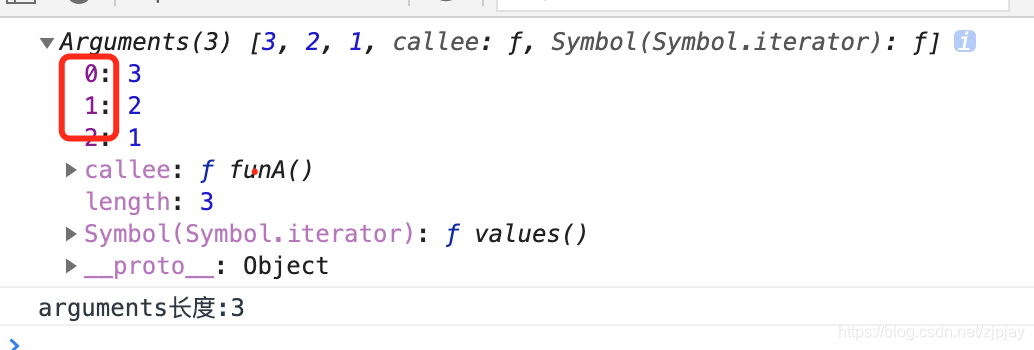 代码执行是可以打印出来arguments的长度的,那么索引值如果体现呢,我们把argument展开就可以看到,如下图