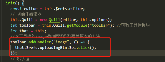 let toolbar = this.Quill.getModule("toolbar"); //获取工具栏模块
