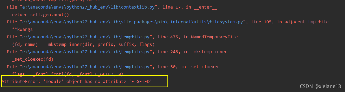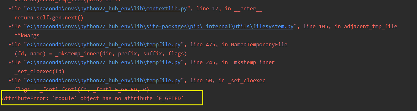 首先,我目前的Python版本为2.7,在做一个django框架下的项目。但是每次pip一些包或者命令的时候,总会报错:AttributeError: 'module' object has no attribute 'F_GETFD',如下图: