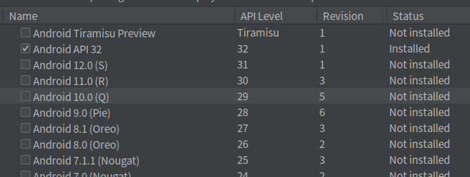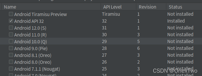 但其实还有一种方法可以解决 licenses 未被接受问题,那就是在 AndroidStudio 的 SDK manager (如下截图)中将 Android API 的卸载然后再安装一次(把 Android API 前面的勾点掉,apply,再把勾点上,再 apply),重新安装时会提示你是否接受证书,选择接受即可。