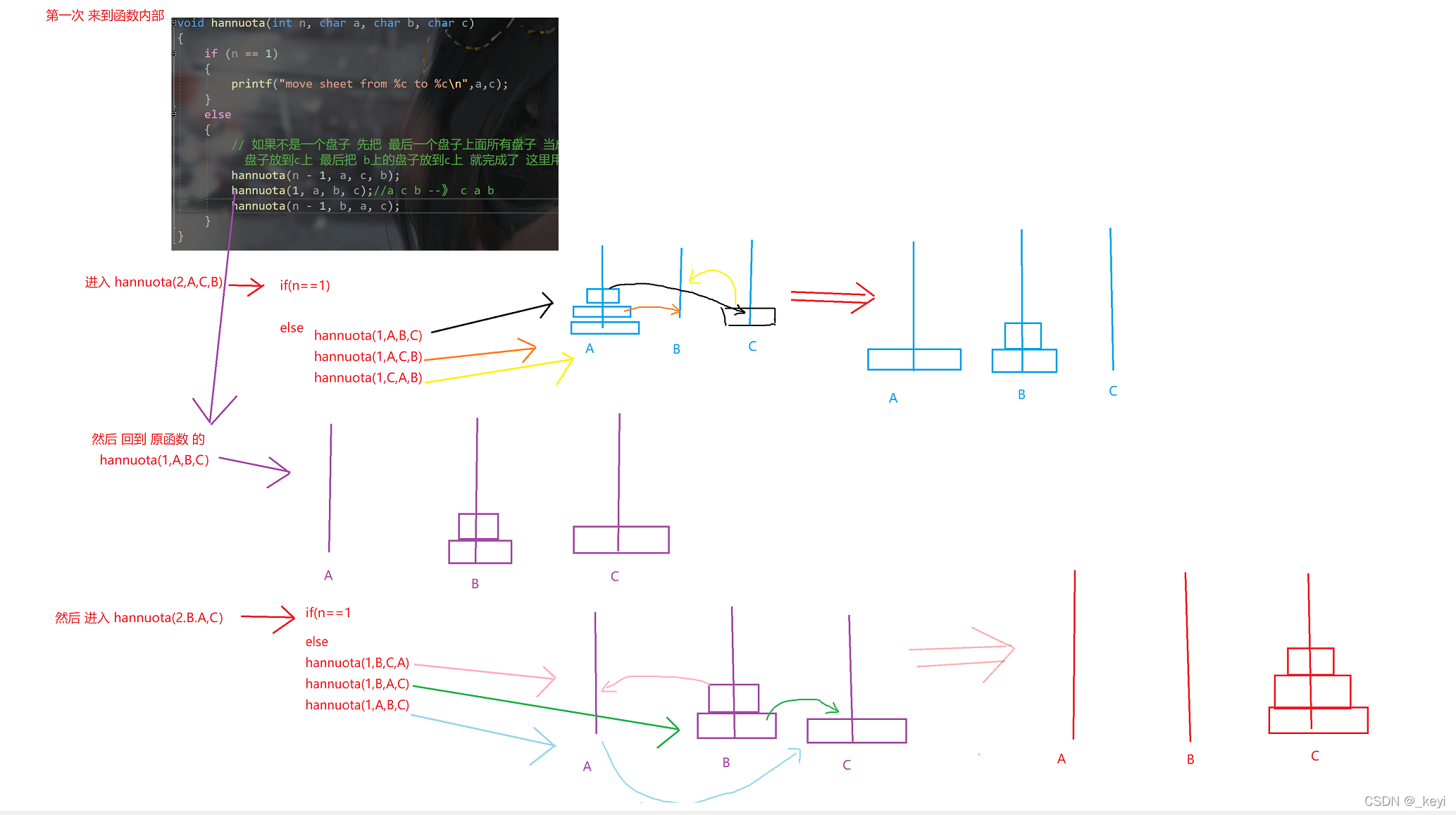 hannuota(n - 1, b, a, c);//将b中的n-1个盘子 放到 c中 再一次需要递归!