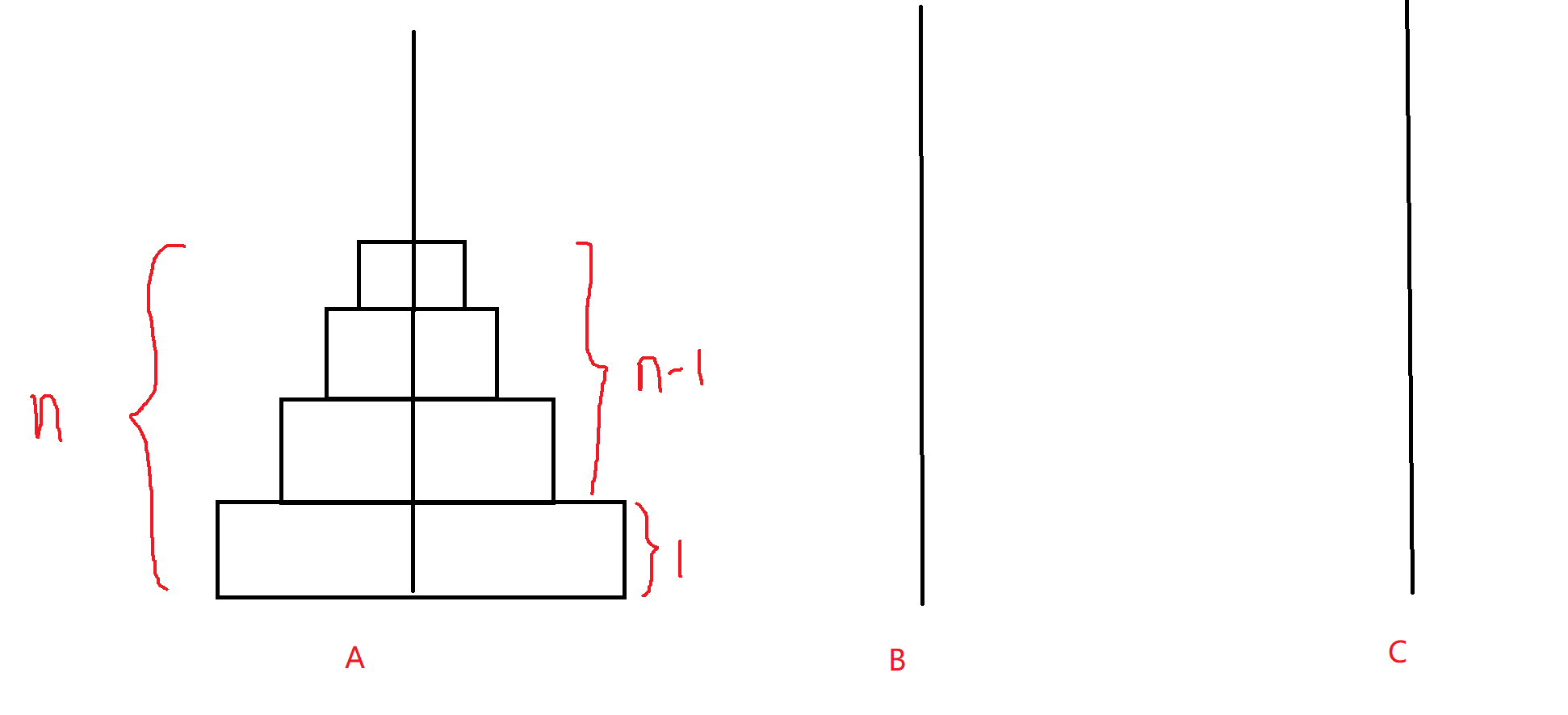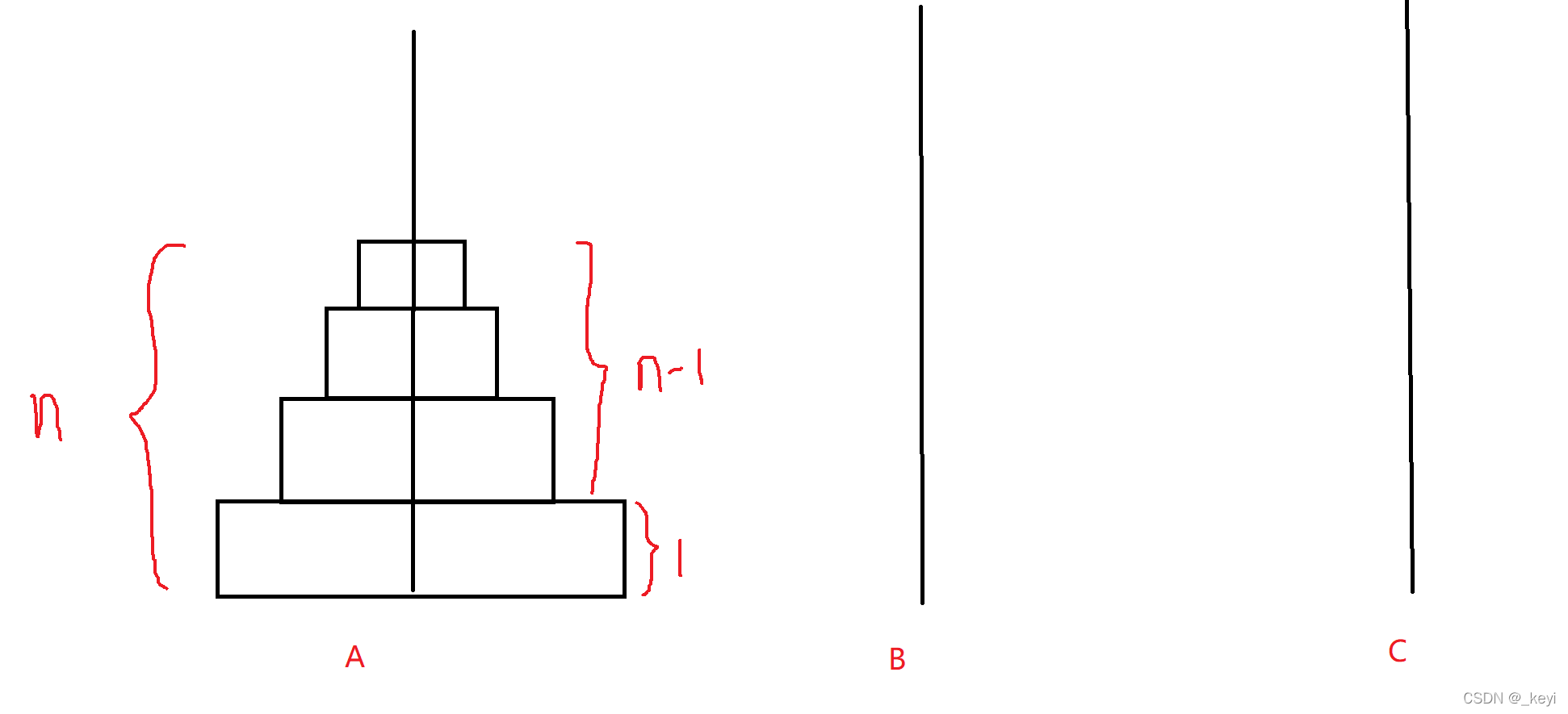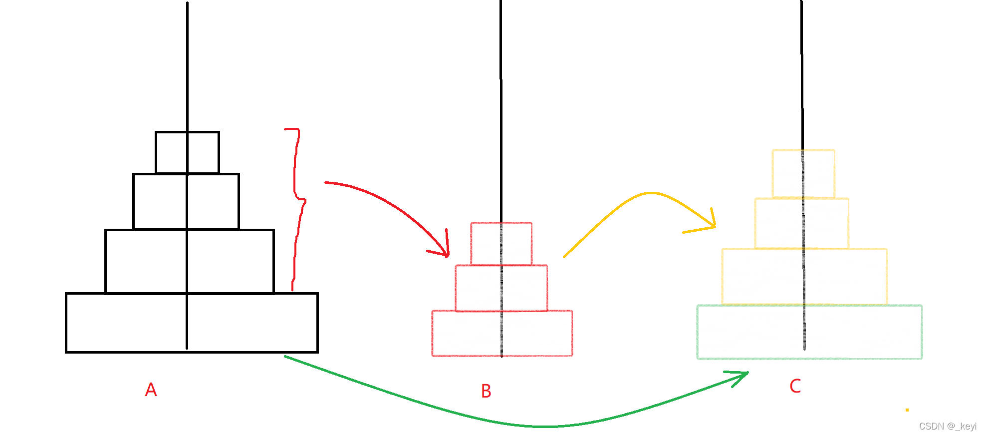 如果有n个盘子为例 我们怎么 借助一个B盘 把所有的盘子 从A柱移动到C柱 ?