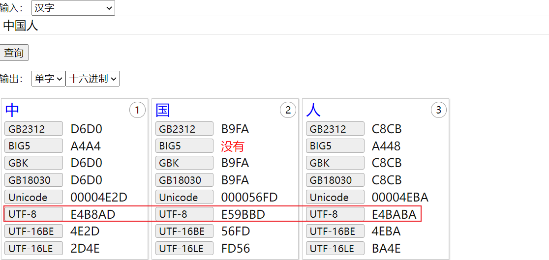由于Golang默认使用的编码格式是UTF-8格式的,UTF-8使用8位来表示一个字节。而汉字使用unicode编码格式来存放,通过占据好几个字节。我们可以通过一些unicode编码表的查询网站查询每个汉字对应的utf-8的编码。如图: