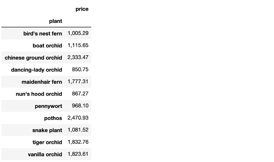 接下来,假设我们要查看每个植物物种花费的金额。我们可以使用pd.pivot_table() 或 .groupby()进行聚合 。