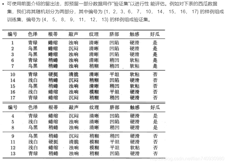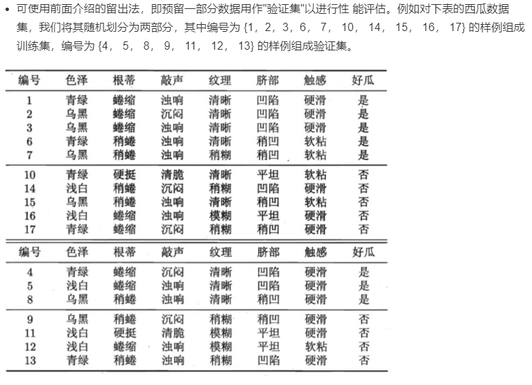 - 用前面表的验证集对这个单结点决策树进行评估。则编号为 {4,5,8} 的样例被分类正确。另外 4个样例分类错误,于是验证集精度为3/7= 42.9%。
