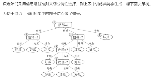 在用属性"脐部"划分之后,上图中的结点2、3、4分别包含编号为 {1,2,3, 14}、 {6,7, 15, 17}、 {10, 16} 的训练样例,因此这 3 个结点分别被标记为叶结点"好瓜"、 "好瓜"、 "坏瓜"。