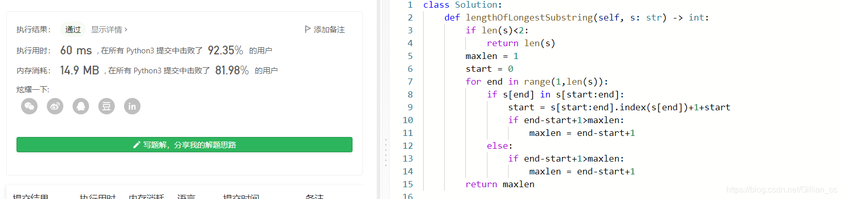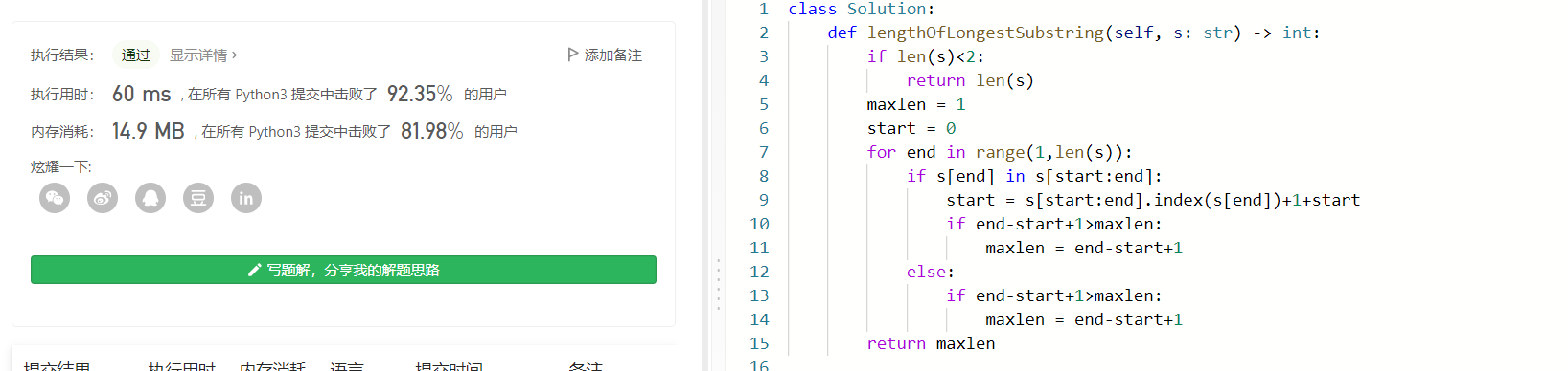 重复上述操作,当新进入窗口字符与原窗口字符有重复时,滑动窗口将左侧元素移出,同时记录每次迭代时当前不重复子串长度,与之前进行比较