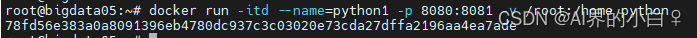 2)创建容器:docker run -itd --name=hello(容器名,随意取) -p 8080:8080(指定暴漏的端口号,根据需求加) -v /root:/home(需要挂载的位置,根据自己需要) python(镜像名) 运行完命令后,出现一串序列说明创建成功