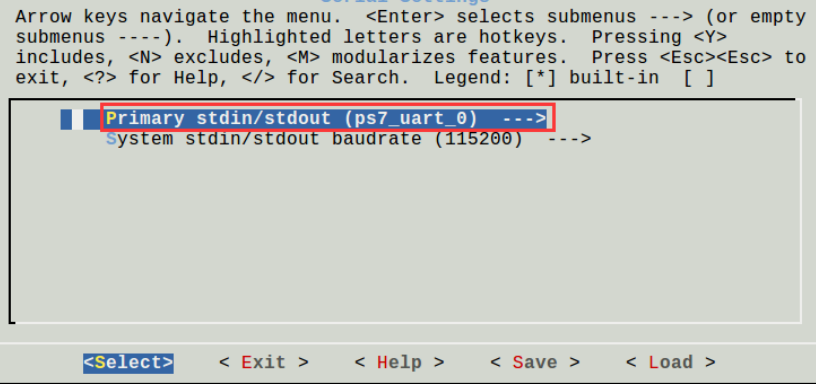 因为领航者开发板有两个串口外设,USB 串口和 RS232、RS485(RS232 和 485 共用),而 板子的调试串口是 USB 串口,所以在“Primary stdin/stdout”配置项中需要将其修改为 ps7_uart_0,ps7_uart_0 对应的就是 USB 串口。修改完成之后连按两次 ESC 键回到上一级菜 单。