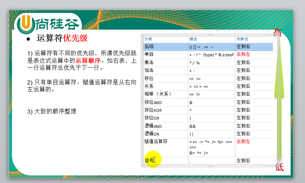 1)运算符有不同的优先级,所谓的优先级就是表达式运算中的运算顺序。如上图,上一行的运算优先级比下一行高