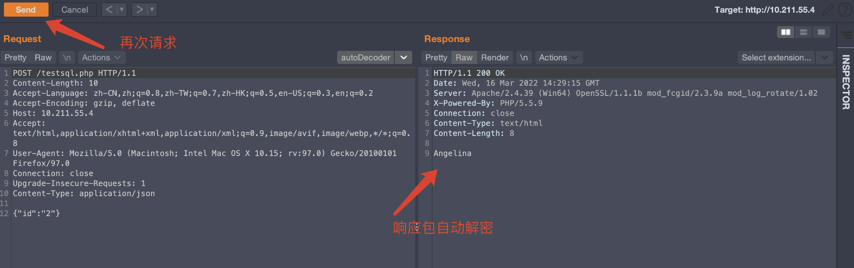再次点击Send按钮进行请求,响应包自动解密