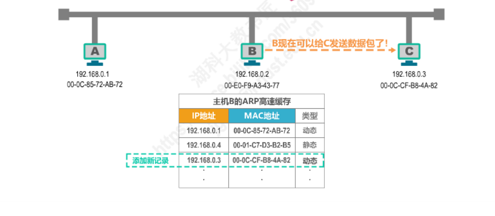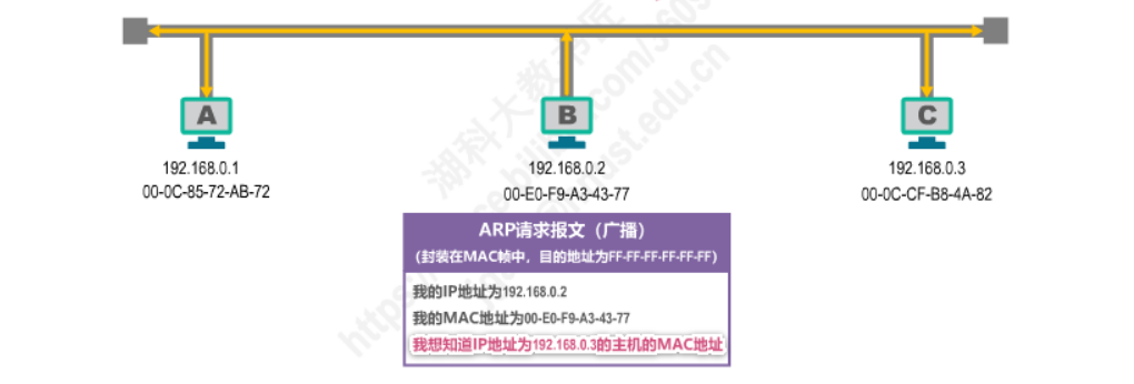 情况:主机B向主机C发送消息,但是在ARP高速缓存中到不到地址映射,这时候,主机B会广播ARP请求报文