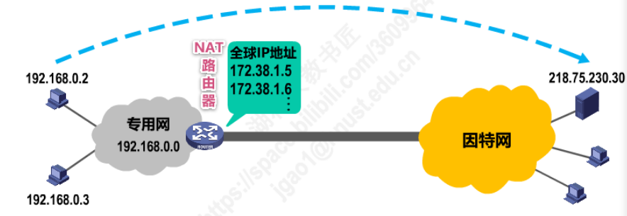 NAT路由器查询内网地址和外网地址映射,传输到专用网中的目的网络地址