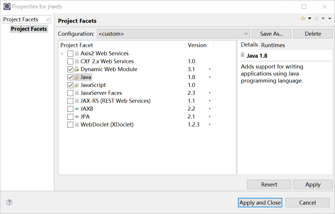 进入后,搜索Project Facets,将Java改为1.8版本,