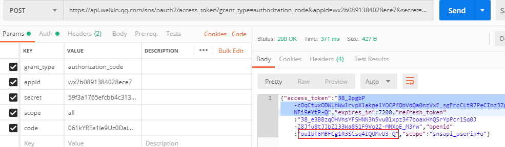 2.使用postman获取token,返回access_token(是一种透明令牌,不是JWT,不含有用的用户信息等,但会返回一个appid),fresh_token