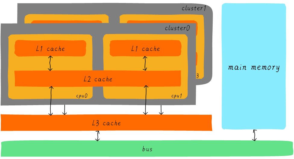 在Cortex-A53架构上,L1 cache分为单独的instruction cache(ICache)和data cache(DCache)。L1 cache是CPU私有的,每个CPU都有一个L1 cache。一个cluster 内的所有CPU共享一个L2 cache,L2 cache不区分指令和数据,都可以缓存。所有cluster之间共享L3 cache。L3 cache通过总线和主存相连。