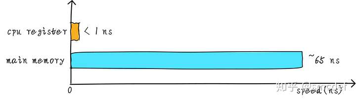 其实现实中,CPU通用寄存器的速度和主存之间存在着太大的差异。两者之间的速度大致如下关系: