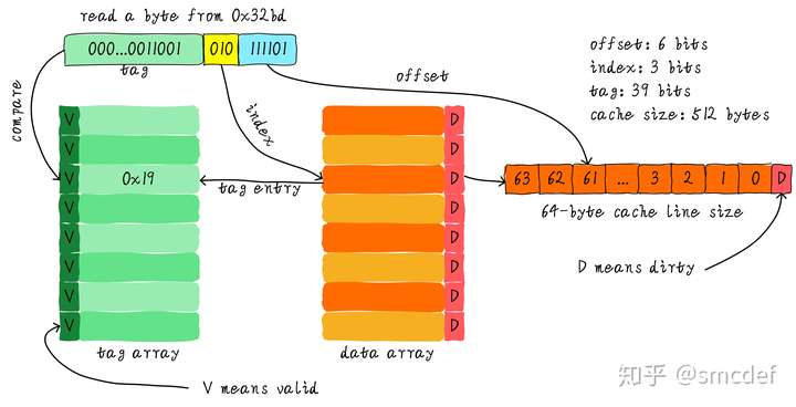 我们一共有8行cache line,cache line大小是8 Bytes。所以我们可以利用地址低3 bits(如上图地址蓝色部分)用来寻址8 bytes中某一字节,我们称这部分bit组合为offset。同理,8行cache line,为了覆盖所有行。我们需要3 bits(如上图地址黄色部分)查找某一行,这部分地址部分称之为index。现在我们知道,如果两个不同的地址,其地址的bit3-bit5如果完全一样的话,那么这两个地址经过硬件散列之后都会找到同一个cache line。所以,当我们找到cache line之后,只代表我们访问的地址对应的数据可能存在这个cache line中,但是也有可能是其他地址对应的数据。所以,我们又引入tag array区域,tag array和data array一一对应。每一个cache line都对应唯一一个tag,tag中保存的是整个地址位宽去除index和offset使用的bit剩余部分(如上图地址绿色部分)。tag、index和offset三者组合就可以唯一确定一个地址了。因此,当我们根据地址中index位找到cache line后,取出当前cache line对应的tag,然后和地址中的tag进行比较,如果相等,这说明cache命中。如果不相等,说明当前cache line存储的是其他地址的数据,这就是cache缺失。在上述图中,我们看到tag的值是0x19,和地址中的tag部分相等,因此在本次访问会命中。由于tag的引入,因此解答了我们之前的一个疑问“为什么硬件cache line不做成一个字节?”。这样会导致硬件成本的上升,因为原本8个字节对应一个tag,现在需要8个tag,占用了很多内存。tag也是cache的一部分,但是我们谈到cache size的时候并不考虑tag占用的内存部分。