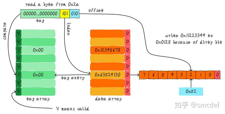 当写回操作完成,我们将主存中0x28地址开始的8个字节加载到该cache line中,并清除dirty bit。然后根据offset找到0x52返回给CPU。
