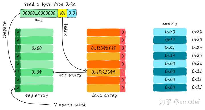 我们可以从图中看到tag旁边还有一个valid bit,这个bit用来表示cache line中数据是否有效(例如:1代表有效;0代表无效)。当系统刚启动时,cache中的数据都应该是无效的,因为还没有缓存任何数据。cache控制器可以根据valid bit确认当前cache line数据是否有效。所以,上述比较tag确认cache line是否命中之前还会检查valid bit是否有效。只有在有效的情况下,比较tag才有意义。如果无效,直接判定cache缺失。
