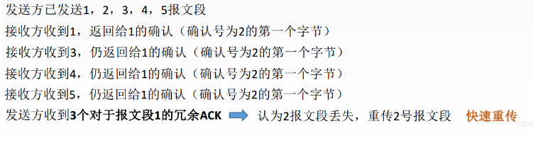 当发送方连续收到三个重复的冗余ACK时,不再等待一个重传计时,而是直接重传对方尚未收到的报文段。