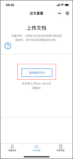 2、在上传文档页面,点击蓝色按钮“选择微信文件”