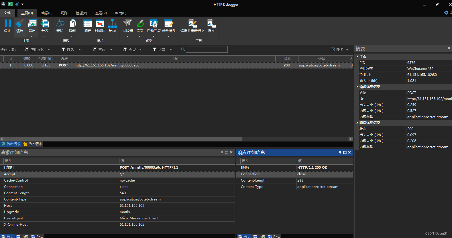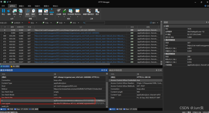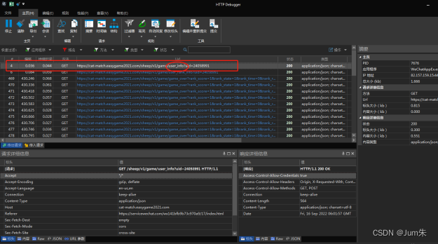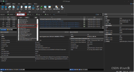 这时候抓包软件就开始抓包,在httpdebugger上选【域名】,选择cat-match域名如下图所示: