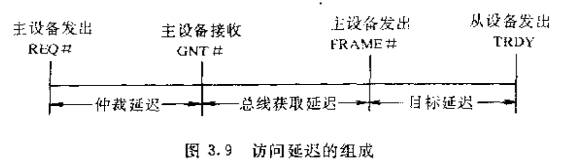 从图3.9可以看出,总线上的一个访问延迟可分为三种访问延迟成分。仲裁延迟对于最高优先级的设备一般为2个时钟,而低优先级设备的仲裁延迟取决于较高优先级设备的数量及使用程度,但比起前者要长一些。总线获取延迟的确定分两种情况,一种时取系统中第一数据期的最长延时;另一种时当所有的第一数据期延时都比较低时,取延时计数器(LT)的值。这里第一数据期延时是指从FRAME#信号有效到TRDY#信号发出之间的时间间隔。对于访问呢延迟的第三部分——目标延迟,一般取第一个数据的延迟。但是对CPU桥上的又经过缓冲的设备,其目标延迟可能会长一些。例如,当某设备通过有缓冲的CPU桥去访问主存时,该桥可能需要先冲洗缓冲器,才允许访问进行。这样一来,就使得目标延迟加大,其增加程度取决于冲洗面向何方和要冲洗缓冲区的大小。