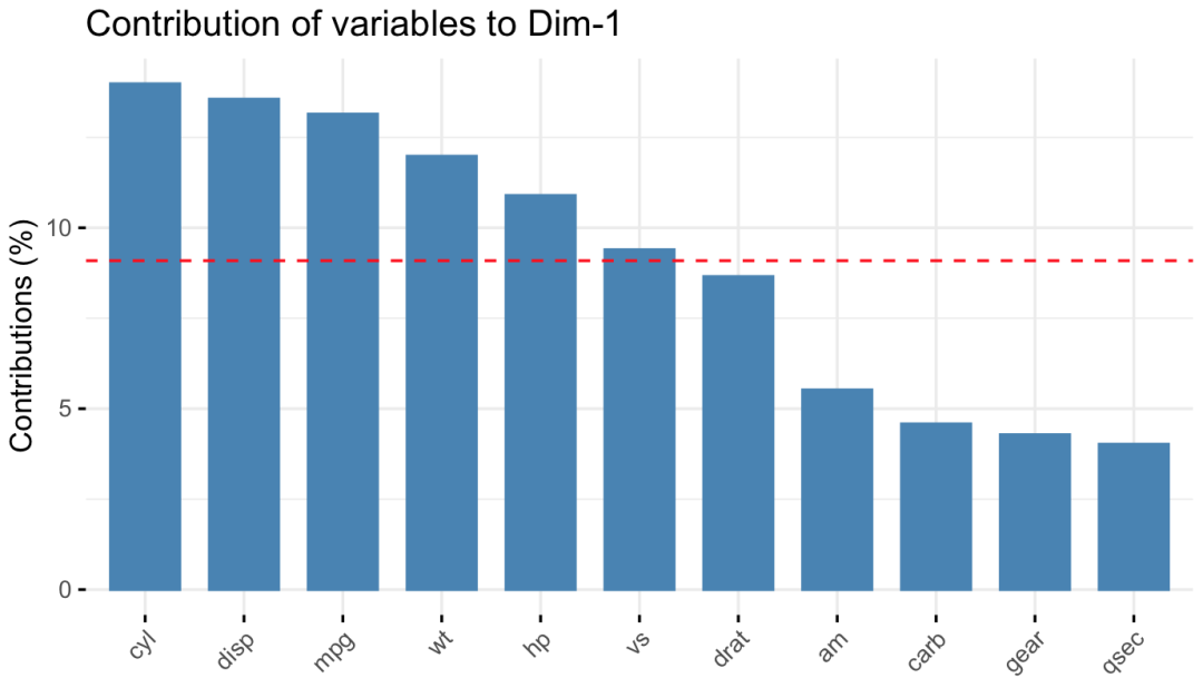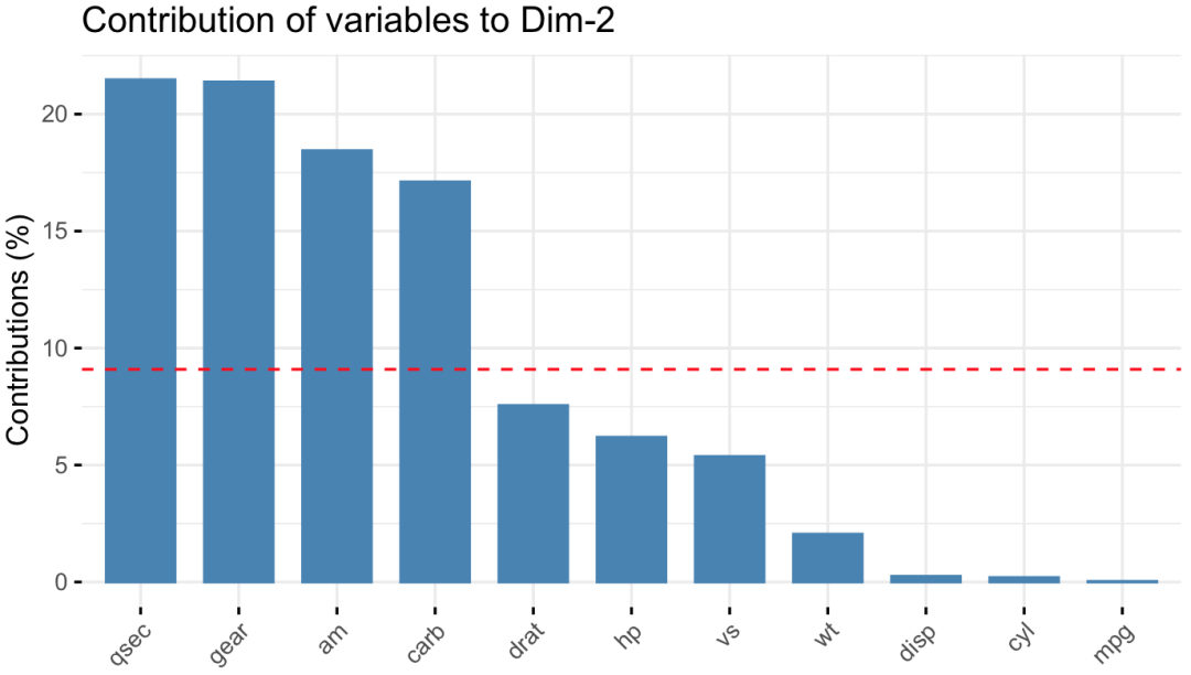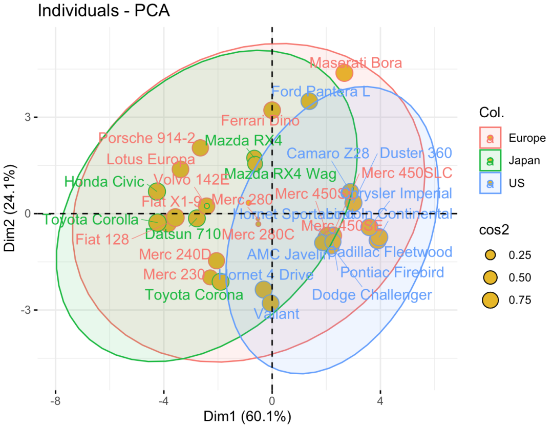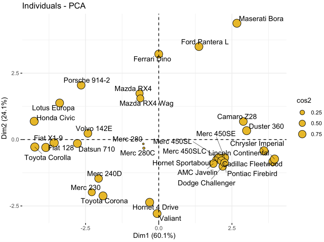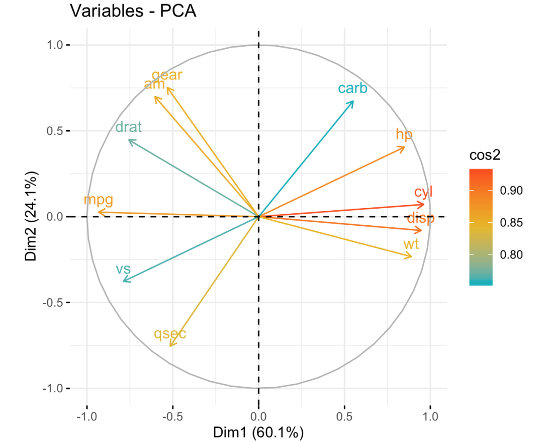 上面这张图为变量相关图,反映了变量与主成分之间的相关关系,图上的变量越接近圆周,则表示该变量对主成分的代表性越强;越接近圆心,则表示该变量对主成分的代表性越差。各变量到各个维度的距离则表现各变量对该主成分的代表性,即cos2。从图上看,mpg、cyl、disp、wt对第一主成分具有较高的代表性,但是对于第二主成分则不具有显著的代表性。