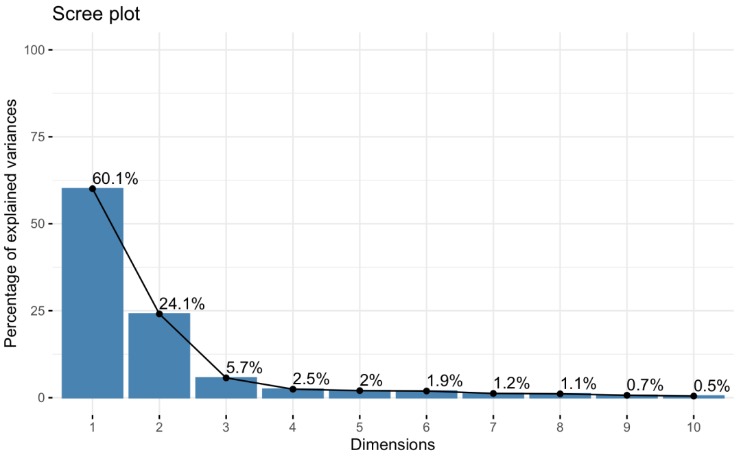 本文采用FactoMineR包的PCA方法进行主成分分析,并以factoextra包进行分析及可视化。