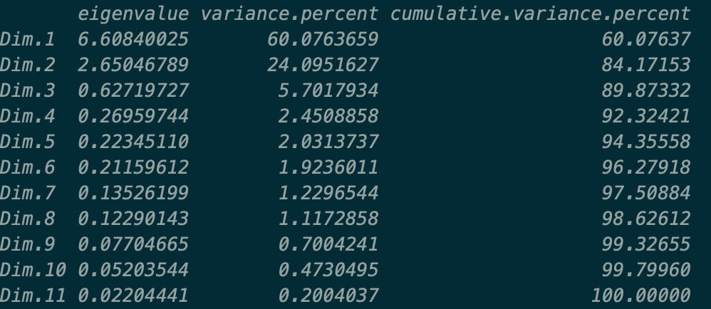 res.pca <- PCA(mtcars, graph = FALSE,scale.unit=T)对于主成分分析,首先需要判断选择多少个主成分合适,一般可以选择特征值大于1的主成分。可以通过factoextra包的get_eigenvalue函数来输出特征值,具体见下图。