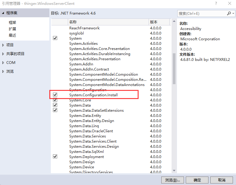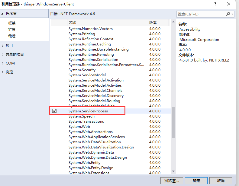 操作服务会使用到两个dll,这两个dll属于系统dll,但是默认是没有添加到引用里的,通过添加引用,从程序集中将这两个引用勾选上,如下图所示: