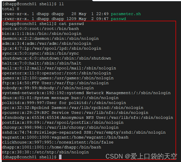 [dhapp@conch01 shell]$ cut -d : -f 1 passwd #表示passwd文件的第一列内容 root bin daemon adm lp sync shutdown halt mail operator games ftp nobody systemd-network dbus polkitd rpc rpcuser nfsnobody postfix chrony sshd vagrant clickhouse dhapp ntp [dhapp@conch01 shell]$1.2、 截取passwd文件的第一列和第三列内容: