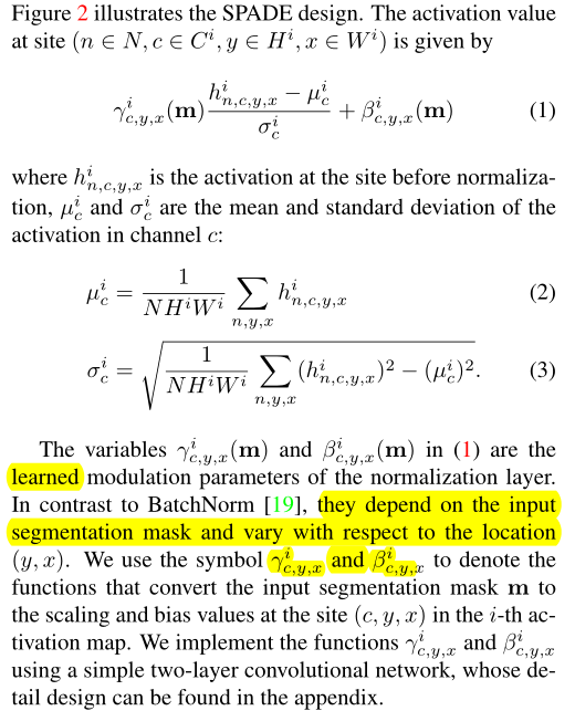Similar to Batch Normalization, the activation is normalized in the channel-wise manner, and then modulated with learned scale and bias.这两个因子是通过卷积学来的,作者认为they depend on the input segmentation mask and vary with respect to the location (y, x).