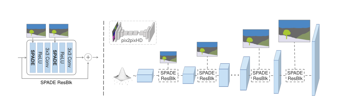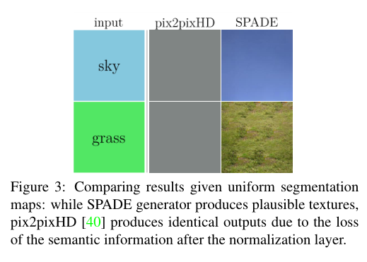 先前的工作(指的是pix2pix,pix2pixHD)是:semantic layout 作为网络input。作者认为由于normalization会洗掉语义信息,提出网络的输入the input layout for modulating the activations in normalization layers through a spatially adaptive, learned transformation.通过空间自适应学习转换使用输入语义布局来调制激活函数,这个翻译我一直不怎么理解。