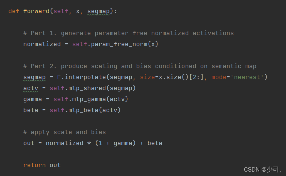 注意这里的代码:spade是先经历过norm的,输出经过actvn后再conv一大堆。而先前网路是直接喂入mask图后卷积balabala。