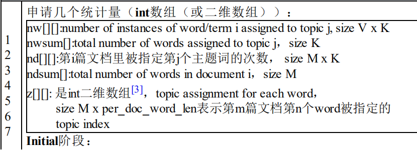 令nw[word_id][t]、nwsum[t]、nd[m][t]三个统计量均−1 (-1三部曲的第一步)