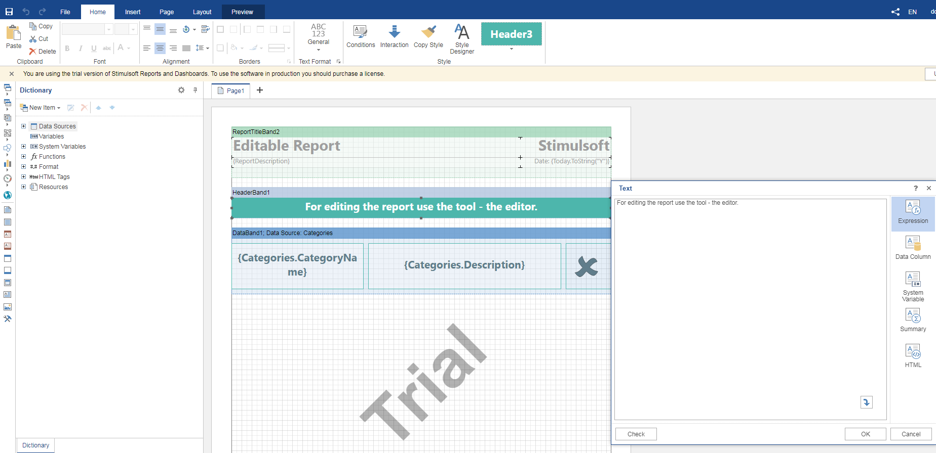 最近有一个做投标系统的客户向我提出了这样的需求:需要一个插件来固定投标文件的模板,指定编辑的位置,最终实现编辑工程量清单的功能。我为他推荐了专业报表控件Stimulsoft Report,完美解决了客户需求!接下来小编将为您介绍如何具体实现该功能。