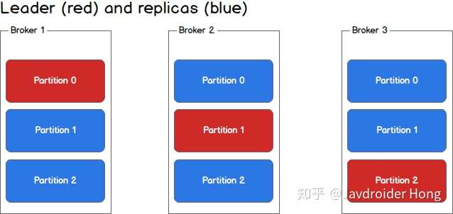 每个partition不再只有一个,而是有一个leader(红色)和多个replica(蓝色),生产者根据消息的topic和key值,确定了消息要发往哪个partition之后(假设是p1),会找到partition对应的leader(也就是broker2里的p1),然后将消息发给leader,leader负责消息的写入,并与其余的replica进行同步。