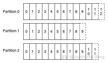 二代Kafka引入了Partition的概念,也就是采用多条队列, 每条队列里面的消息都是相同的topic: