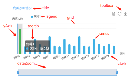 通常一个Echarts图表通常由title(标题)、legend(图例)、grid(网格)xAxis(x轴)、yAxis(y轴)、dataZoom(区域缩放)tooltip(提示框组件)、toolbox(工具栏)、series(系列列表。每个系列通过 type 决定自己的图表类型)组成。例子如下图所示: